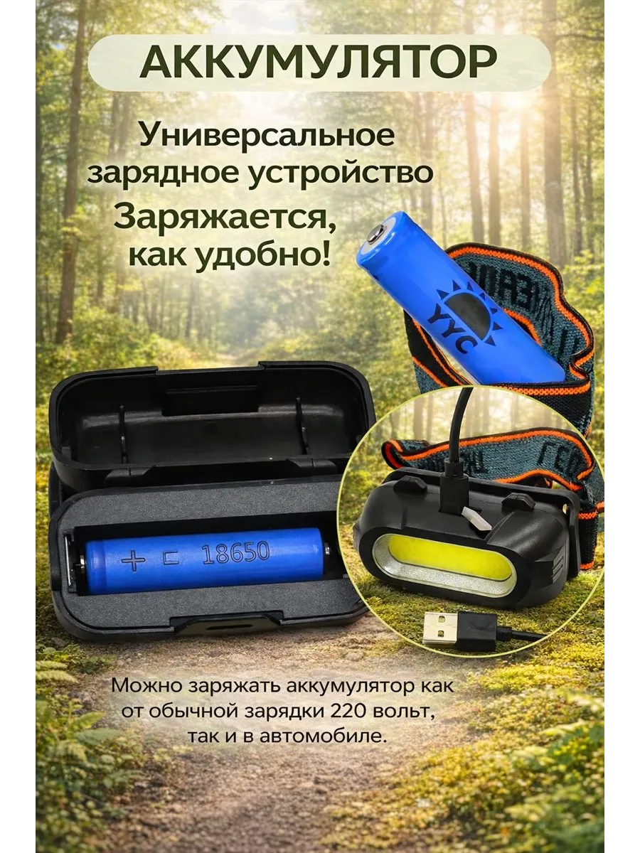Компактный светодиодный налобный фонарь COB. Корпус выполнен из прочного пластика. Устройство использует съемный аккумулятор, который легко зарядить с помощью прилагаемого USB-кабеля. В комплекте с фонарем идёт усиленный (НЕ тестовый!!!) аккумулятор 18650 с ёмкостью 1800 mAh, благодаря чему продолжительность работоспособности фонаря увеличивается в разы! И не нужно дополнительно тратить деньги и преобретать другой аккумулятор.