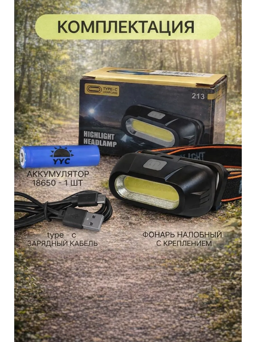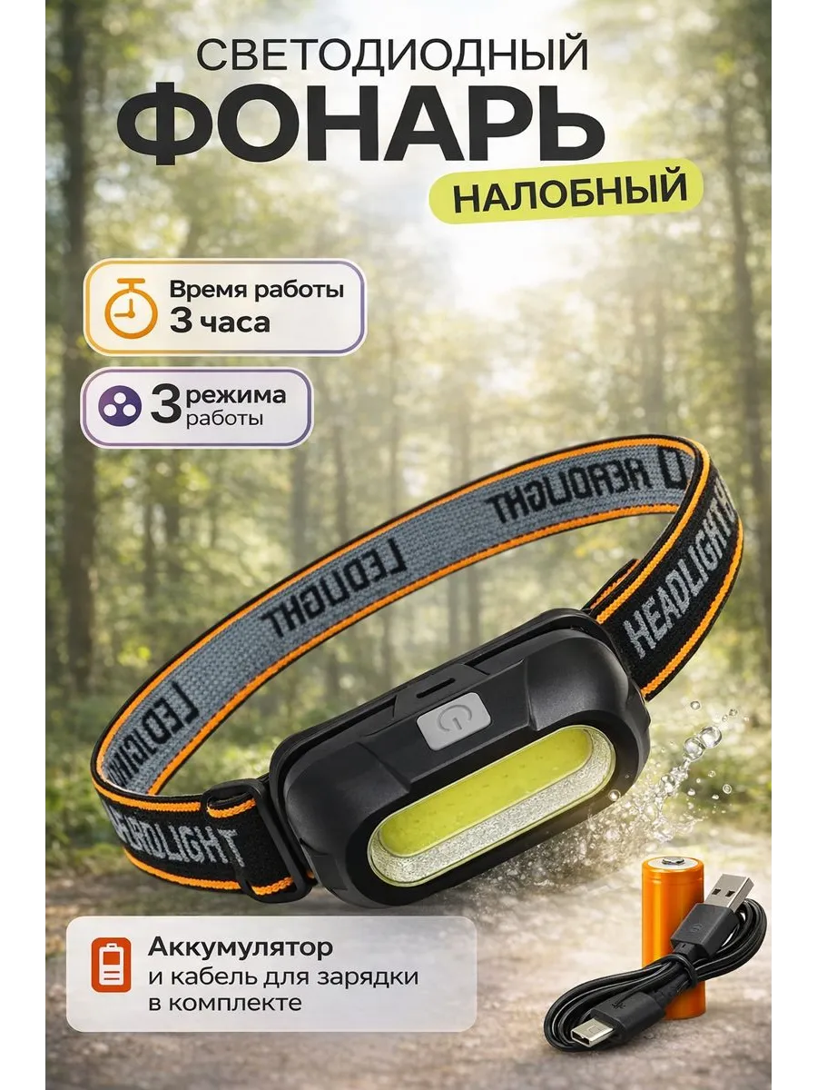 Налобный фонарь, 1 аккумулятор, USB провод