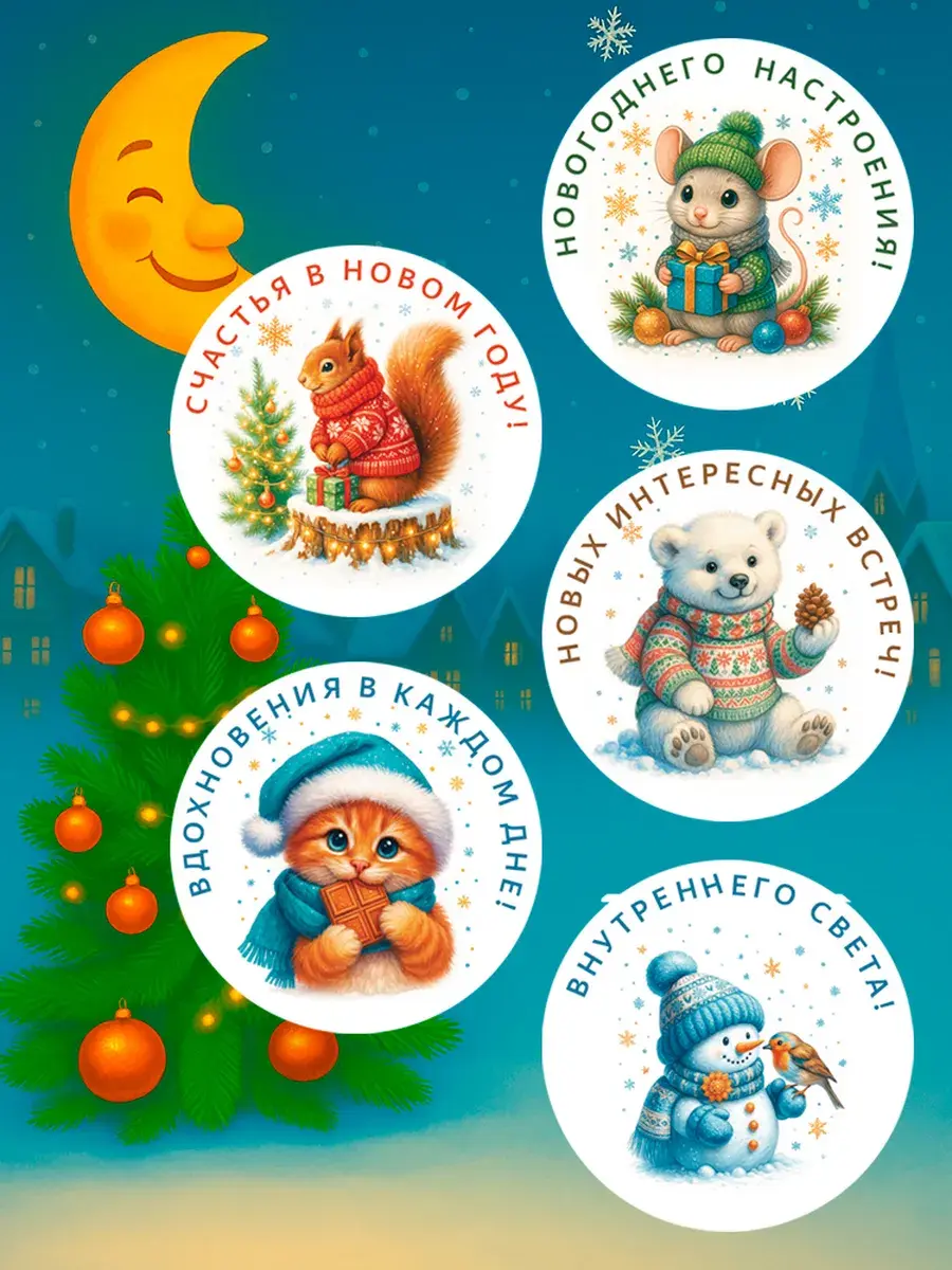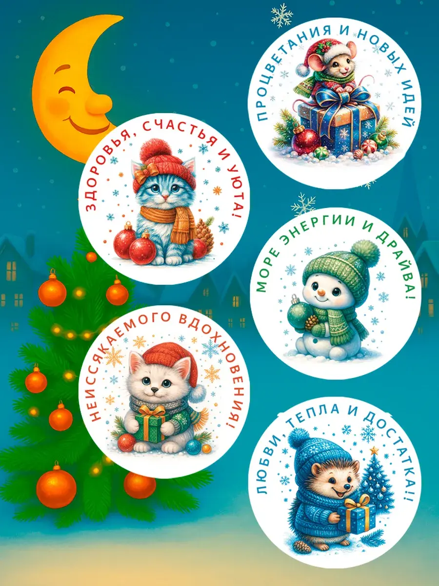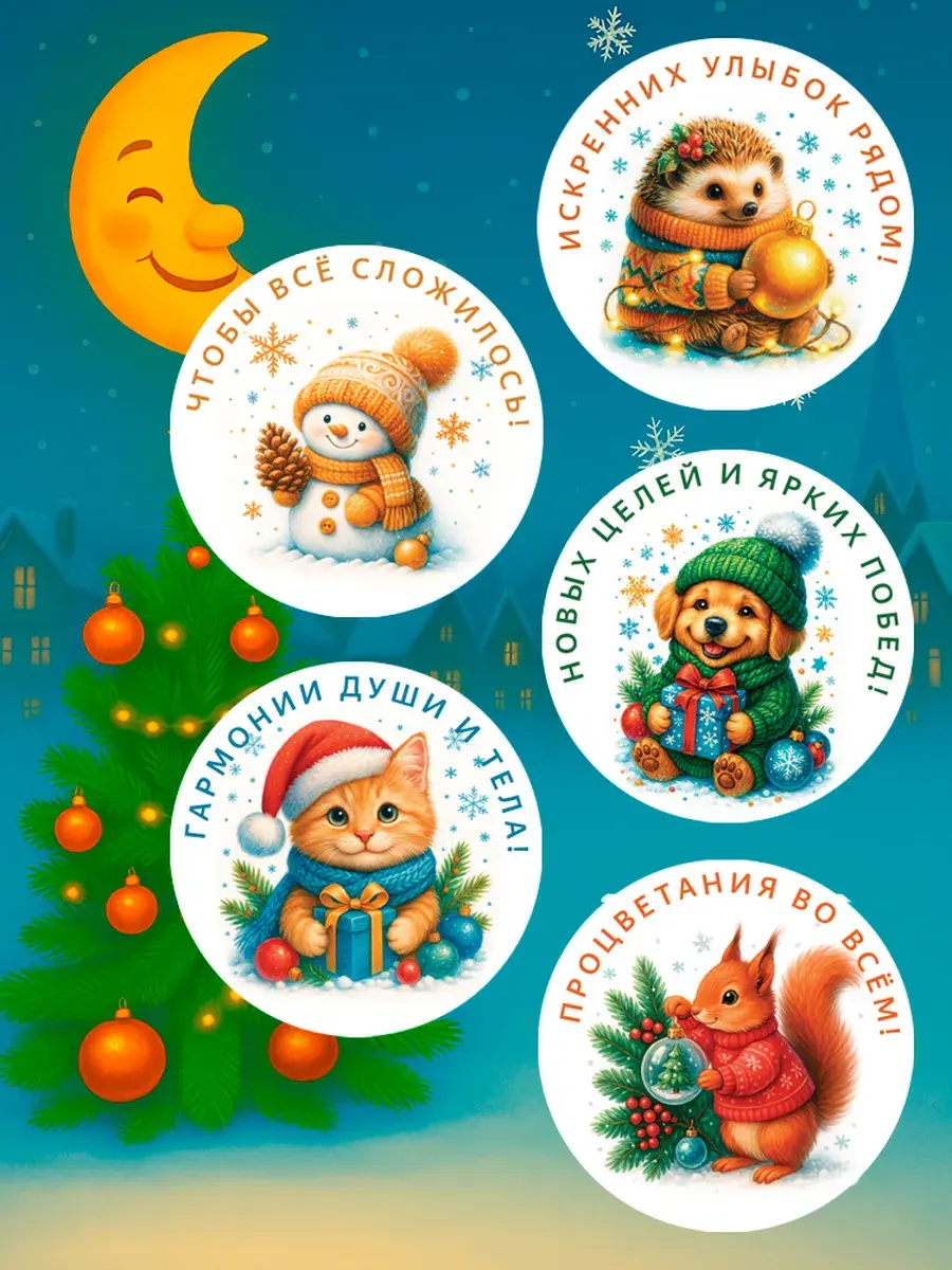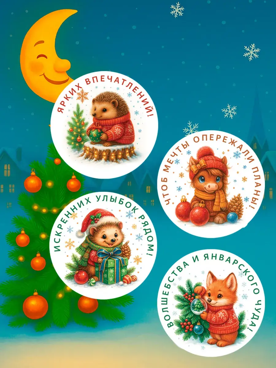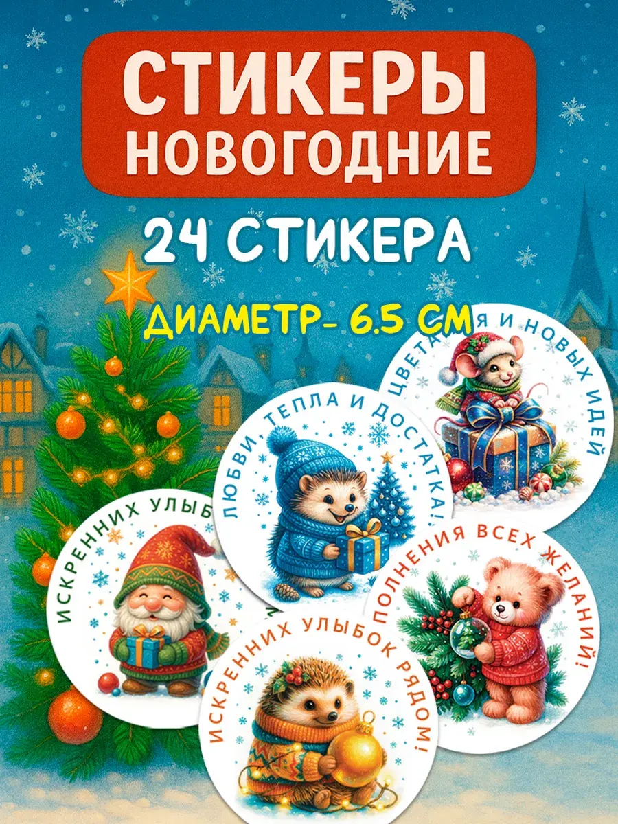 Набор праздничных стикеров — это универсальное решение для создания новогоднего настроения! 24 круглые наклейки диаметром 65 мм с уникальными добрыми дизайнами станут ярким акцентом для ваших сюрпризов.