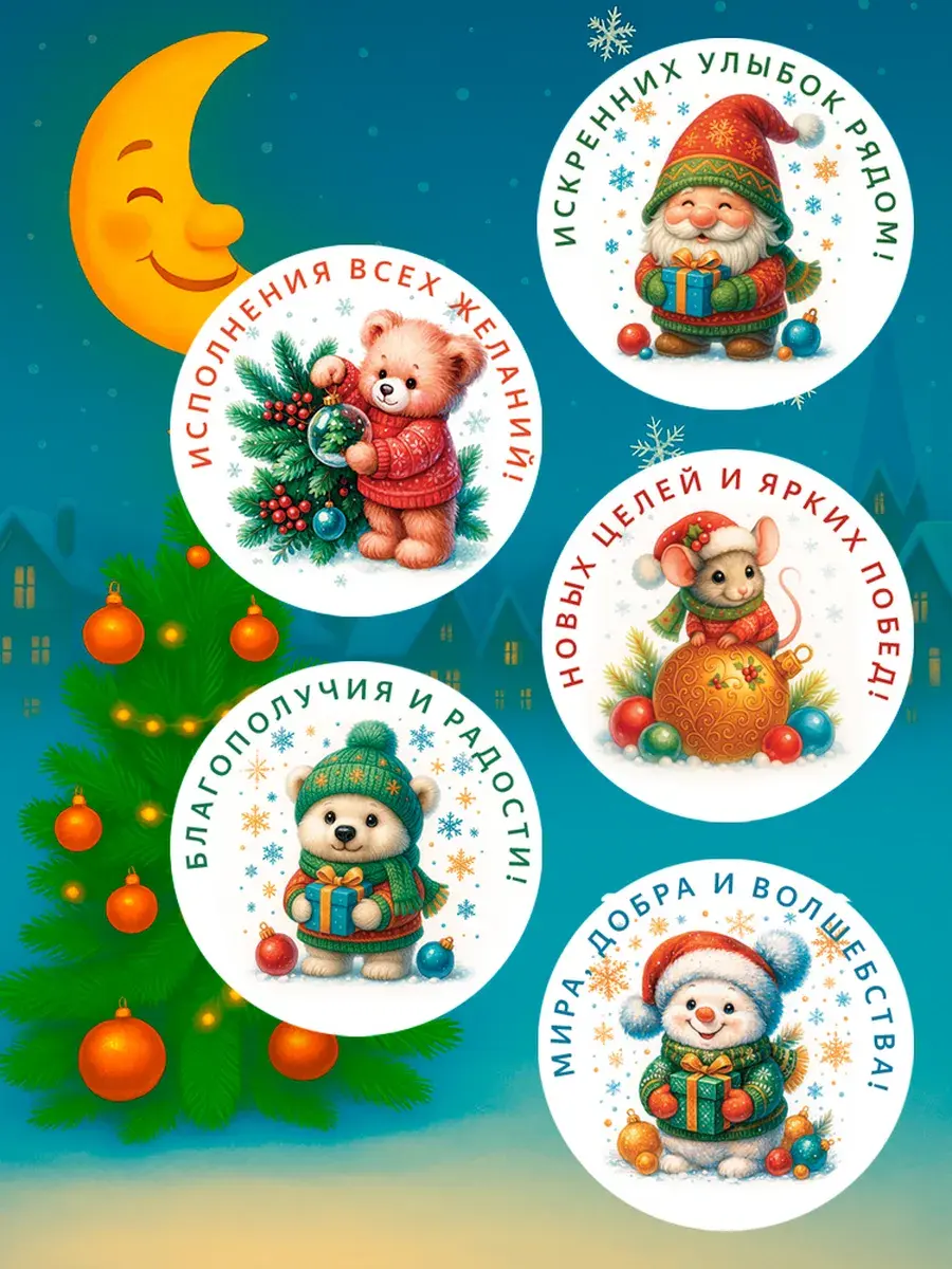 Набор праздничных стикеров — это универсальное решение для создания новогоднего настроения! 48 круглых наклеек диаметром 65 мм с уникальными добрыми дизайнами станут ярким акцентом для ваших сюрпризов.