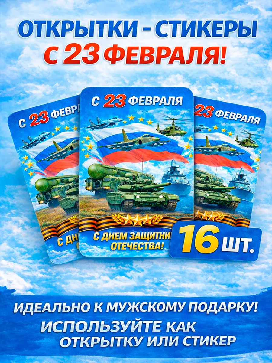 Открытки-стикеры с 23 февраля — универсальное решение для оформления подарков к празднику! В наборе 16 ярких открыток размером 7×10 см — оптимальный формат, чтобы использовать их как поздравительную карточку или наклейку.