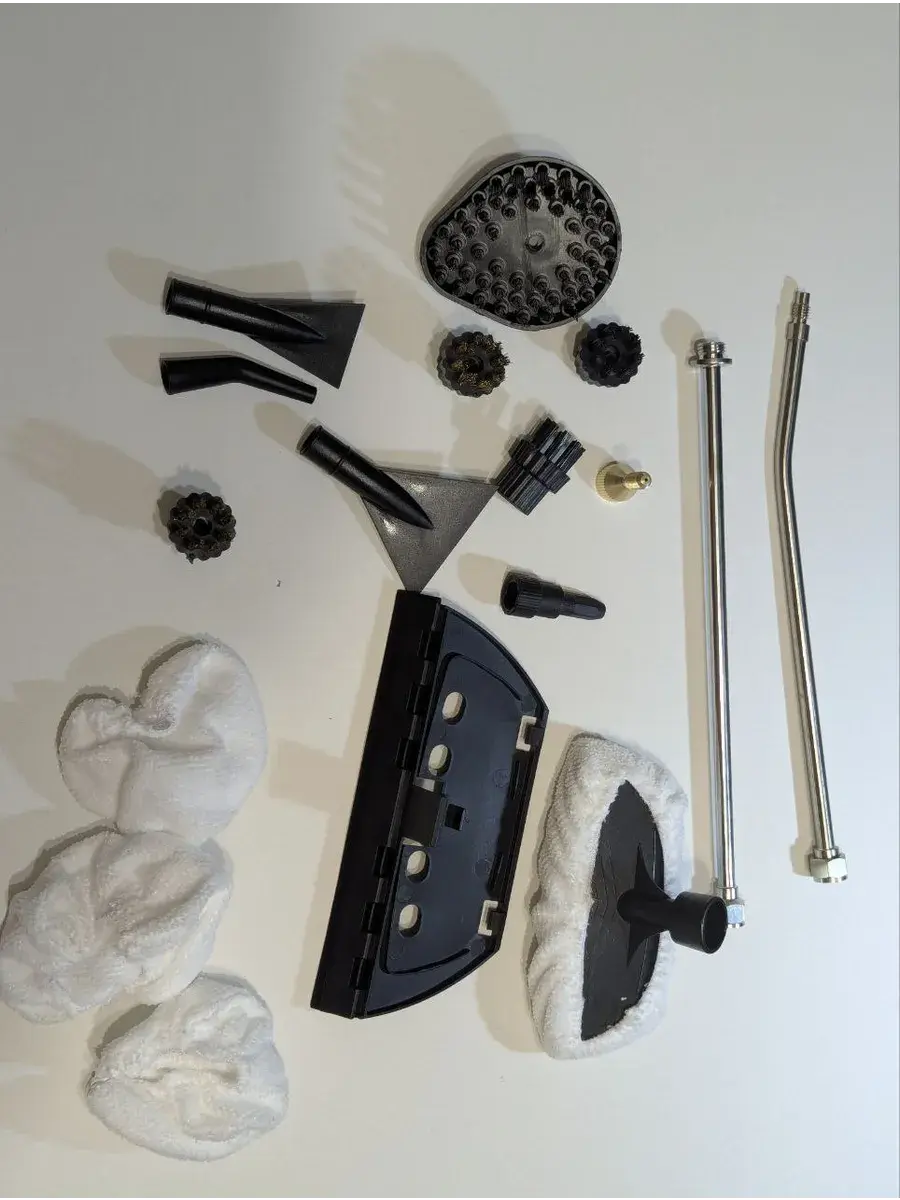 Комплектация включает 15 насадок, среди которых скребки, стальные и мягкие щетки, узкие и широкие насадки, удлинители и насадки для мебели, окон, плитки, ковров и авто. Это делает прибор идеальным для уборки в ванной, на кухне, в прихожей и даже для химчистки в домашних условиях. Установка насадок происходит легко и надежно, с использованием уплотнительных колец.