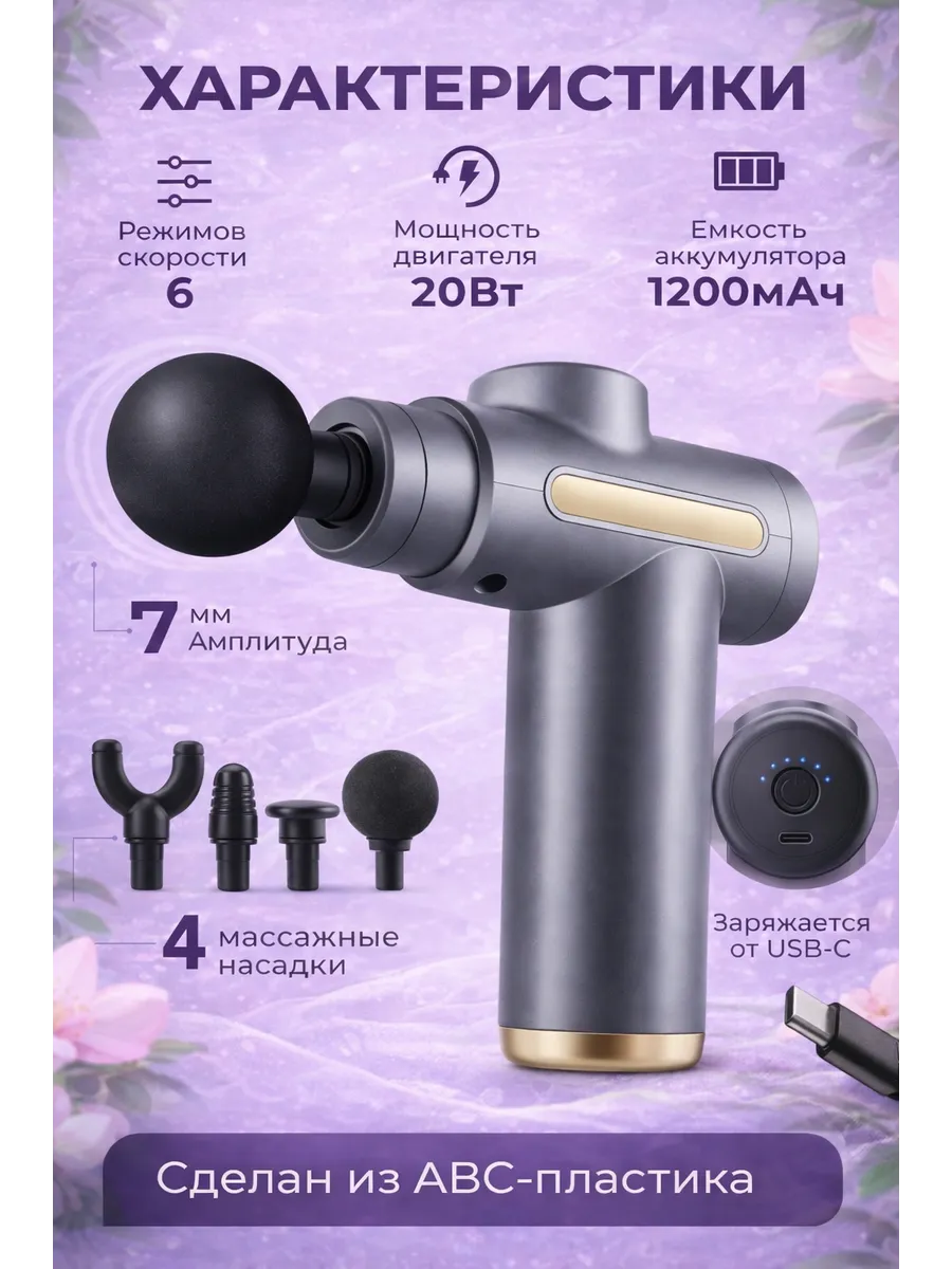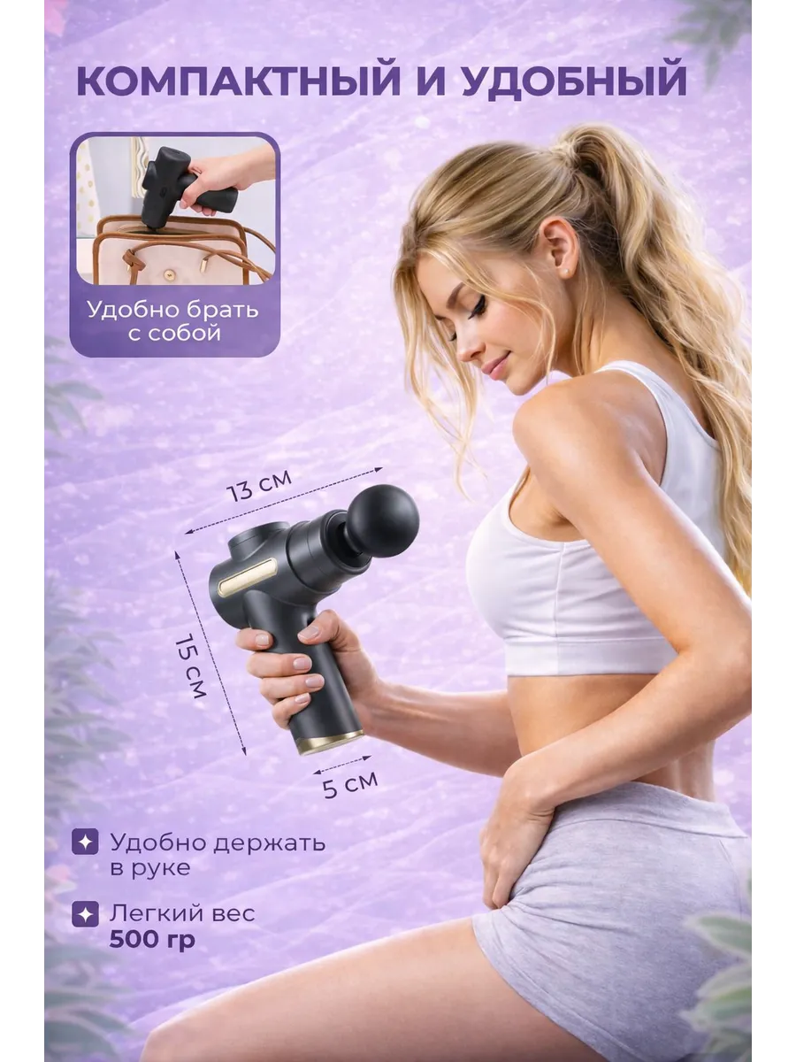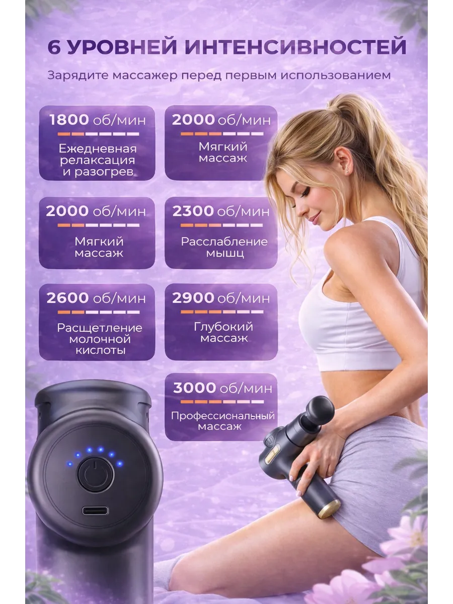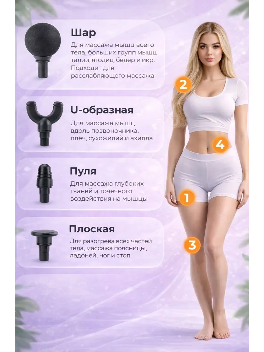Перкуссионный массажер для тела с четырьмя насадками - это удобное и эффективное устройство для того, чтобы глубоко расслабить мышцы и восстановить их после физической нагрузки, стресса или напряжения.