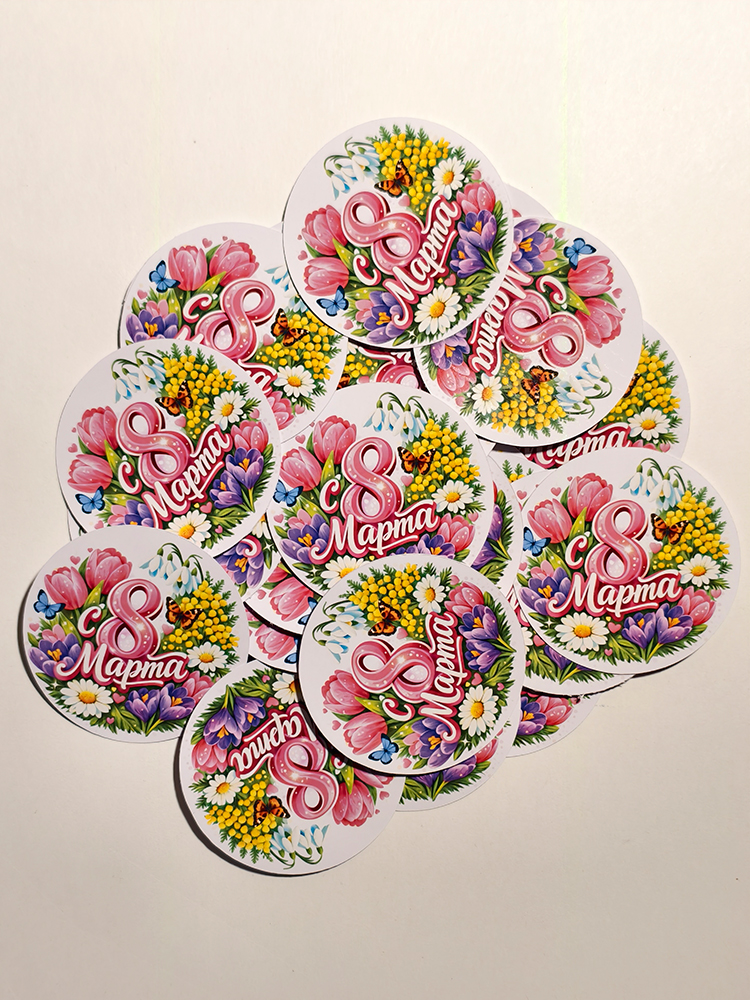 Стикер-наклейка для подарка с 8 Марта это простой способ красиво оформить презент и добавить весеннее праздничное настроение! Круглая наклейка диаметром 67 мм с нежным тематическим дизайном станет ярким акцентом на упаковке, конвертах и открытках.