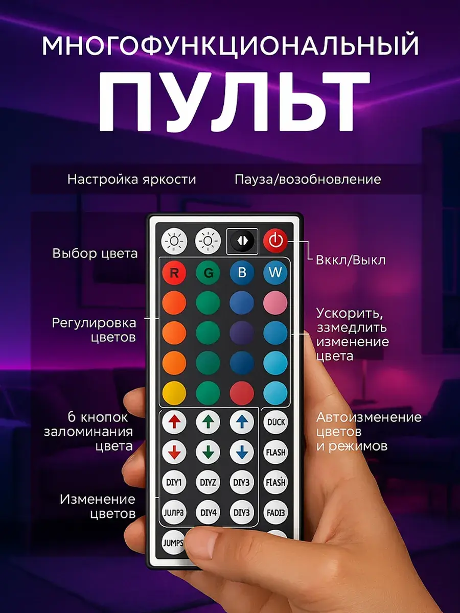 Лента подходит для детской, спальни, кухни или оформления праздников. Клеевая основа позволяет легко установить подсветку на стены, мебель, потолок или за телевизор. Просто включите в розетку и управляйте светом через пульт или смартфон!