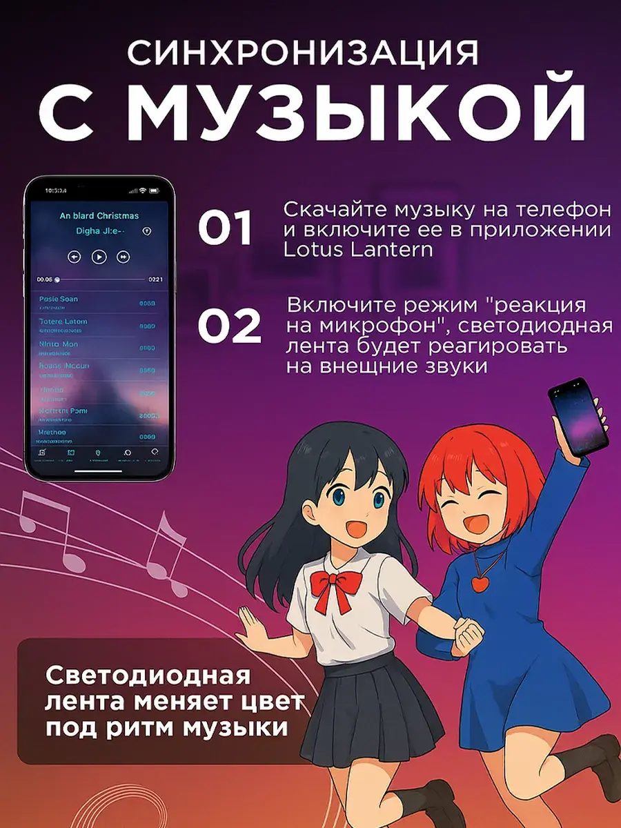 - Синхронизация с музыкой: встроенный микрофон реагирует на звуки, и лента мерцает в такт ритму.
