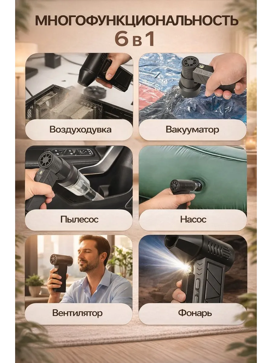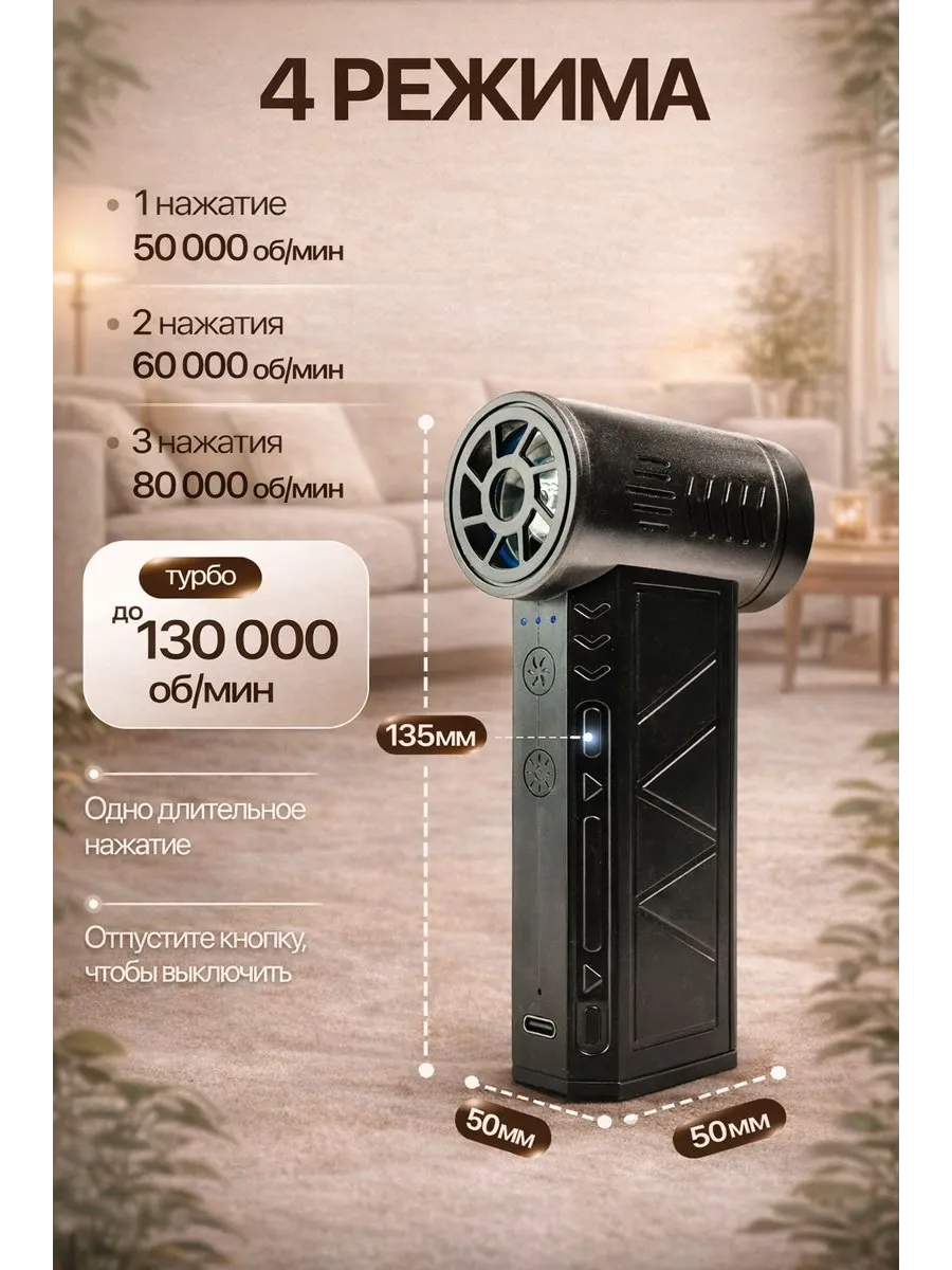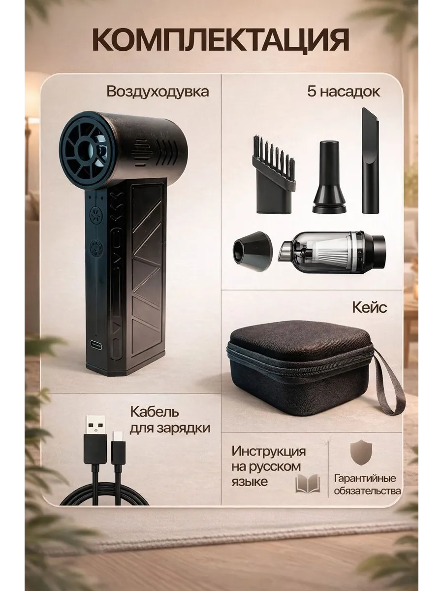 Наша ветродуйка аккумуляторная – это удобный и эффективный инструмент для очистки различных поверхностей. Ветродуй идеально подходит для ухода за автомобилем, сдувания снега, чистки компьютеров, обдува мангала и других задач. Основные преимущества: • Мощный турбовентилятор обеспечивает высокую скорость воздушного потока, что делает устройство отличным выбором для удаления пыли, листвы, снега и грязи. • Портативная конструкция позволяет легко использовать воздуходуйку дома, на улице или в гараже. • Функция обдува для очистки автомобилей, ПК, клавиатуры, бытовой техники и углей в мангале. Используйте воздуходувку аккумуляторную мощную для авто, чтобы быстро удалять или сдувать снег с машины, очищать двигатель или продувать вентиляционные системы. Также воздуходувка автомобильная - отличный раздуватель снега, снегообдув для машины – просто направьте поток воздуха и мгновенно избавьтесь от снега и пыли. Мини дуйка идеально справляется с обдувом для компьютера – продувает клавиатуру, убирает пыль из системного блока и улучшает охлаждение электроники. Этот беспроводной воздуходув ускоряет разжигание углей, а также помогает в садовых работах, продувая листву и мусор. Air Duster можно использовать как турбовентилятор ручной для быстрого обдува любых поверхностей или как сдуватель снега с машины ручной, обдувку от снега, а так как выдуватель пыли. Долговечный аккумулятор обеспечивает продолжительную работу без подзарядки. Прочный корпус гарантирует надежность и устойчивость к ударам. Простота в использовании – достаточно нажать кнопку, чтобы активировать мощный воздушный поток. И наконец, турбо вентилятор – это не только полезный инструмент, но и идеальный подарок для мужчины, парня, отца или друга на день рождения или любой другой праздник.