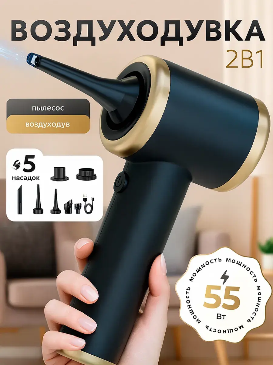 Аккумуляторная воздуходувка-пылесос 2 в 1 — универсальное устройство для уборки и продувки, созданное для дома, автомобиля, офиса и электроники. Благодаря мощности 55 Вт и силе всасывания 12000 Па прибор легко справляется с пылью, крошками и мелким мусором даже в самых труднодоступных местах. Вы можете использовать его как мощный ручной пылесос для машины или как воздуходув для очистки клавиатуры, ноутбука, системного блока и бытовой техники.