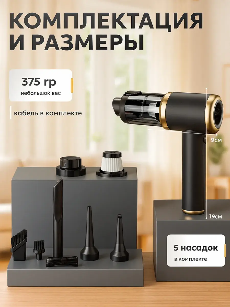 В комплект входят 5–9 насадок для разных задач: узкие щётки и трубки для очистки вентиляционных решёток, клавиатуры и труднодоступных мест, а также широкие насадки для уборки сидений, ковриков и поверхностей. Прибор можно использовать как воздуходув для удаления пыли и крошек или как мини-пылесос для точечной уборки.